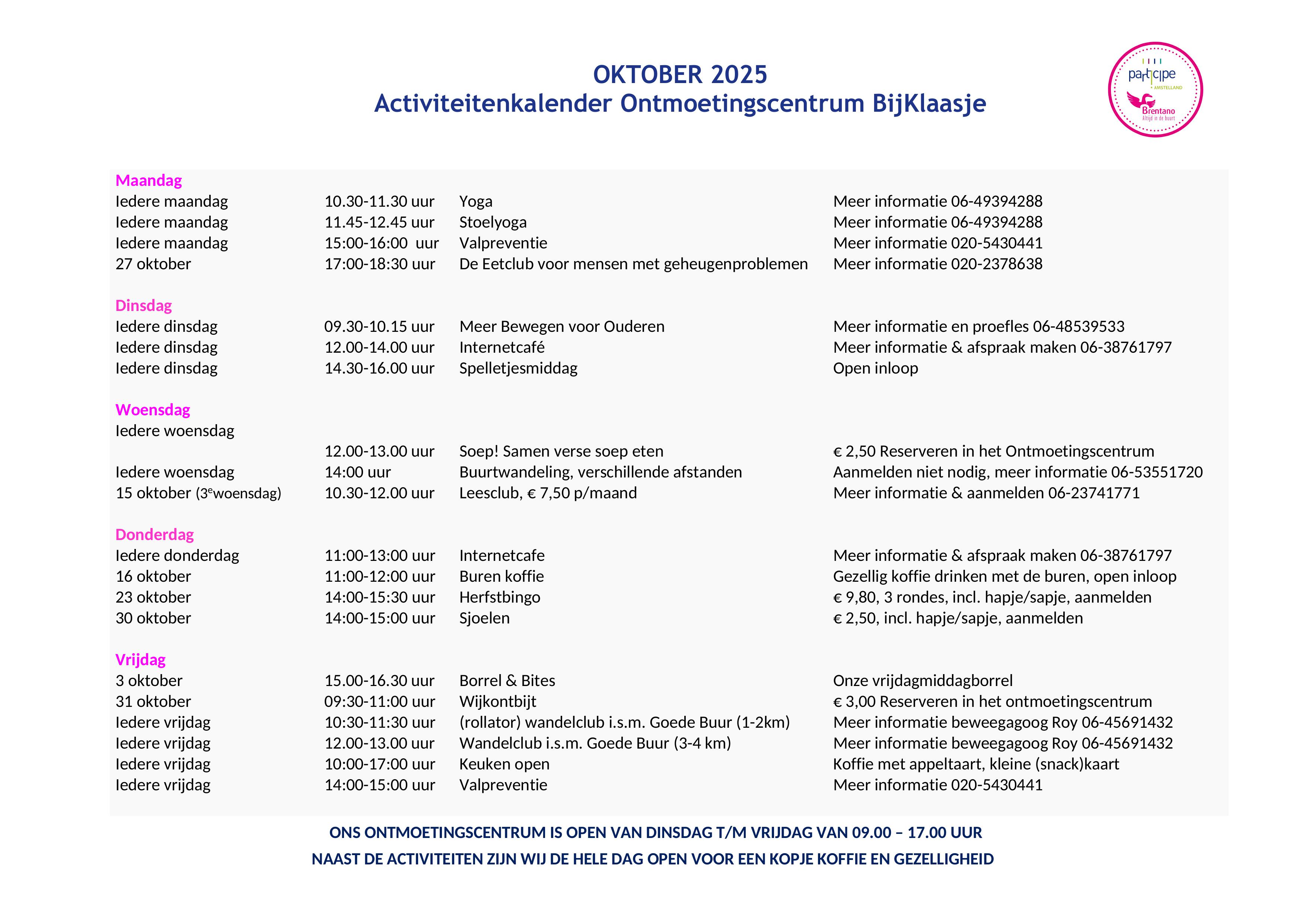 Wees welkom bij BijKlaasje, met iedere maand weer een mooi programma.Daniëlle Jonker, de Sociaal Beheerder van Ontmoetingscentrum BijKlaasje